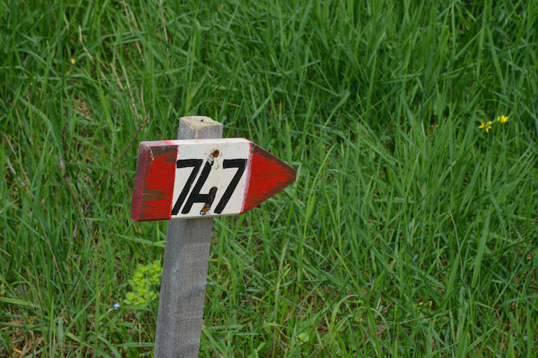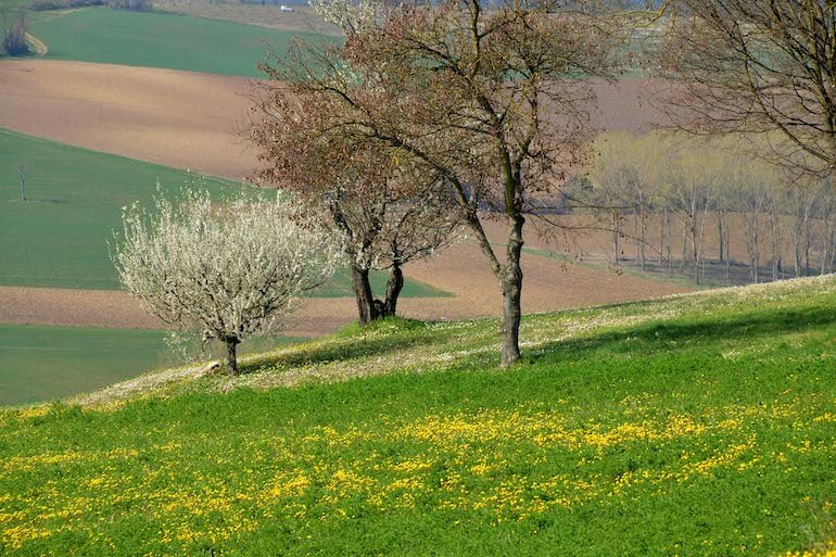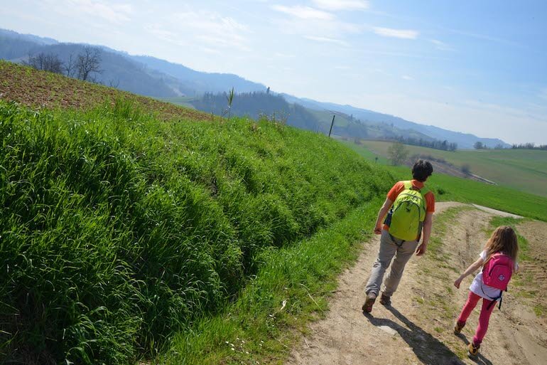 La segnaletica da seguire è il numero 747 e gli sporadici cartelli “I silenti spazi” che ci faranno percorrere per lo più sterrate e piste erbose tra campi coltivati, piccoli boschetti e filari di vigne, procedendo con andamento che alterna discese a salite, sempre dolci e blande che fanno indugiare piacevolmente.