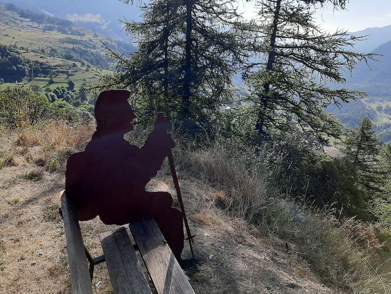 Una sorta di balconata che punta in direzione est-ovest, a volte all’ombra degli alberi, altre aperta al panorama che si fa grandioso proprio dove è stata posta una panchina, con la sagoma dell’amico cui è dedicato il sentiero, la cui storia è possibile approfondire tramite un QrCode apposto sullo schienale.