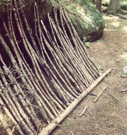Un grande masso erratico, ad esempio, estremamente comune in tutto il territorio italiano, può fungere da ideale parete. Una volta ripulito da detriti il suolo circostante, potete iniziare, avvalendovi di un coltello o anche solamente delle vostre mani (attenzione, sempre protette da guanti!), a creare una sorta di rastrelliera di rami dritti, affiancati l’uno all’altro. In questo modo otterrete l’altra parete.
