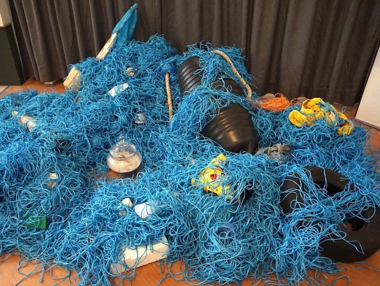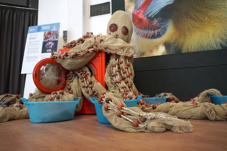 “Mangiamo ciò che laviamo” è composta da una lavatrice con un polpo gigante che esce dall’oblò realizzato con una rete abbandonata, a simboleggiare la quantità di microfibre sintetiche che arrivano in mare dai lavaggi e che entrano nella catena alimentare dei pesci e dell’uomo stesso.