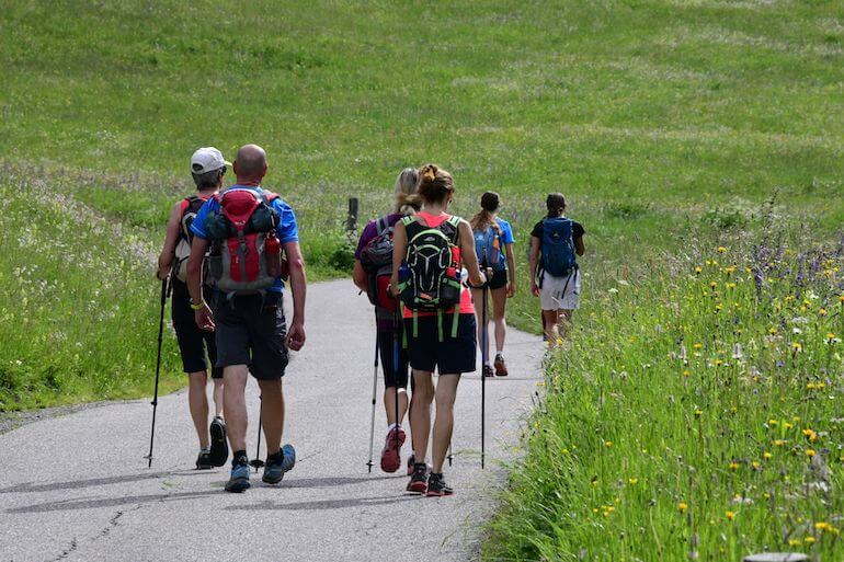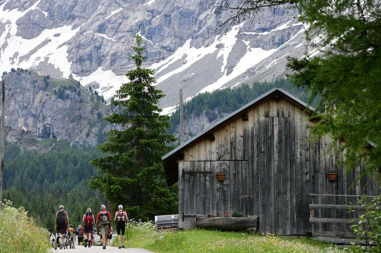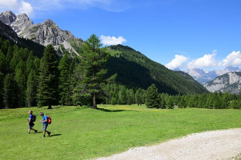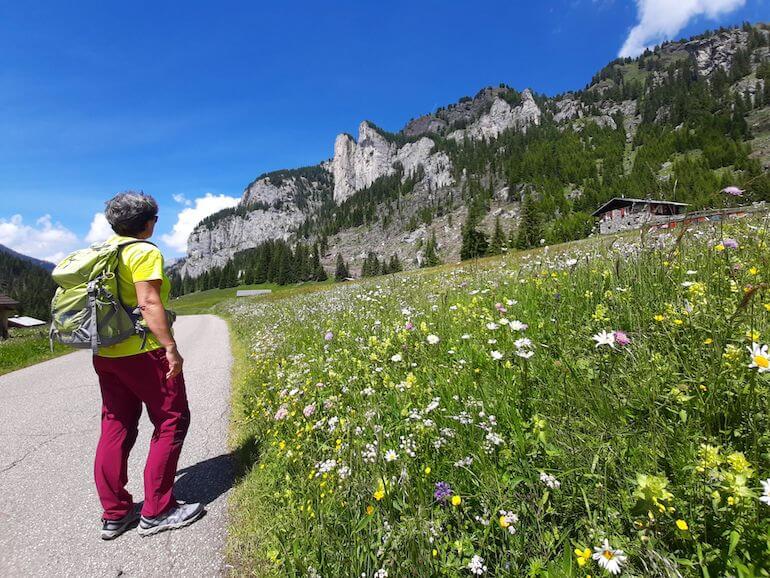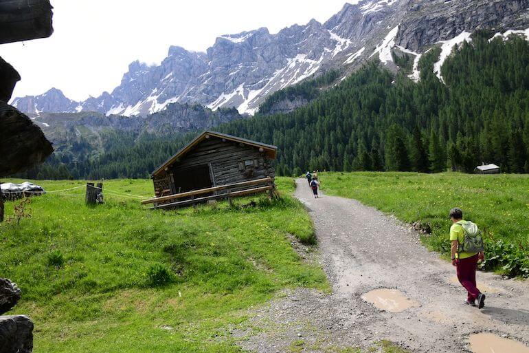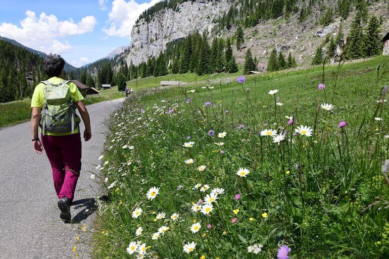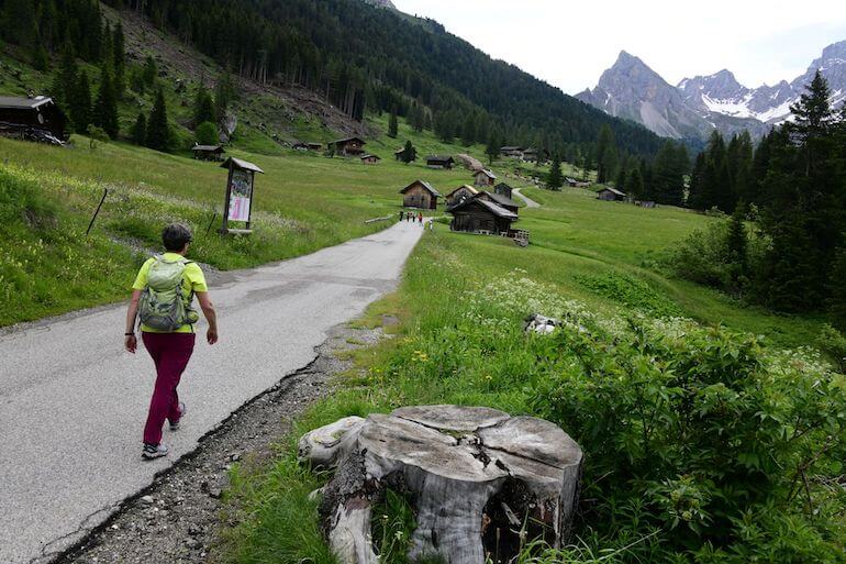 Da Sauch ci teniamo ancora lungo la strada asfaltata in salita graduale che procede in un panorama magnifico con le casette sparse sui verdi pascoli, avendo di fronte le rocciose cime che fanno parte del gruppo della Marmolada. A tratti alcuni cartelli narrano una favola interessante anche per gli adulti poiché insegna termini locali e curiosità.