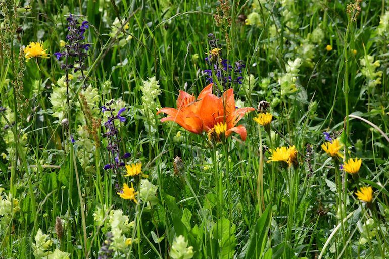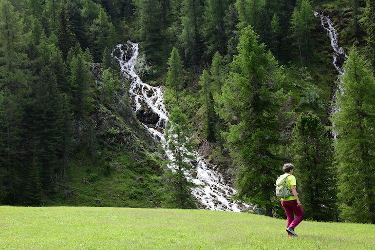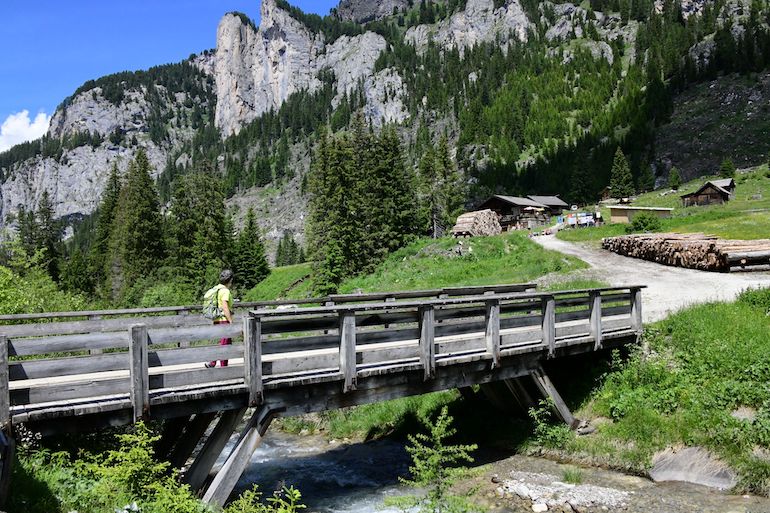 A Ciampiè (1.810 m/slm) termina l’asfalto e continuiamo su sterrata, sempre in salita graduale e in ambiente bucolico e rilassante, fino a deviare decisamente a destra, seguendo il cartello “Pont de Ciamp”, inoltrandoci tra gli alberi per andare ad attraversare l’ampio greto sassoso del torrente I Giaf (1.900 m/slm).