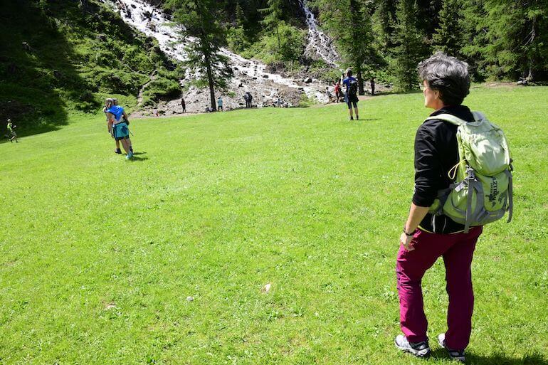 Torniamo sui pascoli mentre il tracciato si fa più ripido e quando diventa una selciata siamo quasi arrivati al bel edifico della Baita alle Cascate (2.011 m/slm) che anticipa di poco il salto delle suggestive cascate del Rio San Nicolò e in cui decidiamo di fare una sosta.