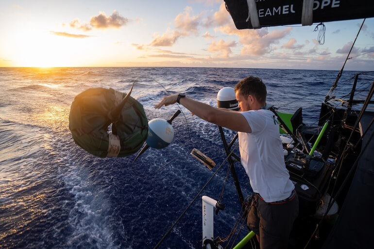Phillip Kasüske lancia in mare la boa galleggiante di superficie. © Charles Drapeau GUYOT environnement – Team Europe / The Ocean Race 2022-23