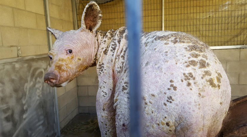 Eve fu trovata la vigilia di Natale del 2017 nella California settentrionale mentre rovistava tra i cassonetti in cerca di cibo. All’epoca pesava appena tredici chili ed era priva di pelo a causa di una grave forma di rogna, considerato tra i più gravi mai osservati dagli esperti.
