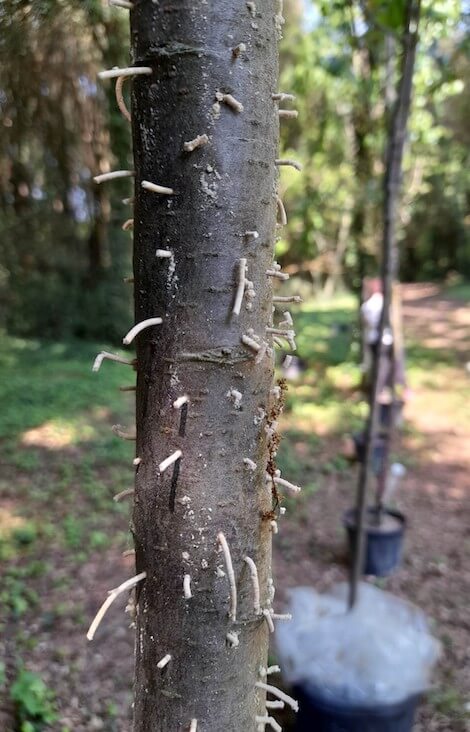 I segni della colonizzazione da parte dei coleotteri del legno sulle piante artificialmente sottoposte a stress. © UNIPD