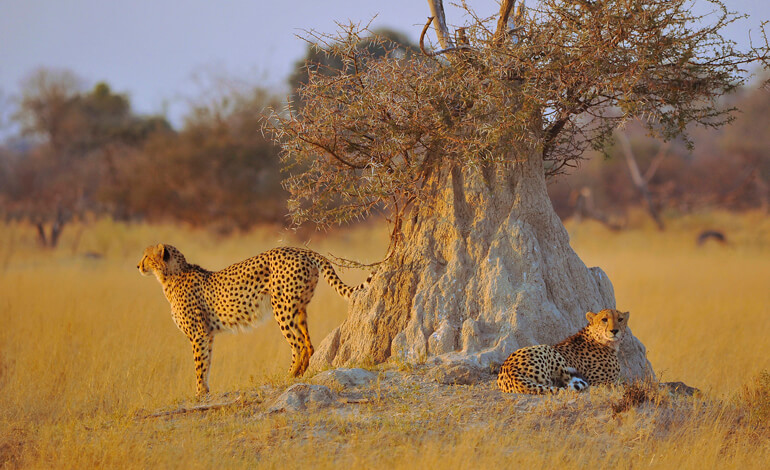 Due ghepardi marcano il territorio usando come riferimento un termitaio costruito attorno a un’acacia. © F. Tomasinelli