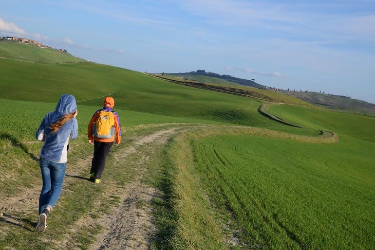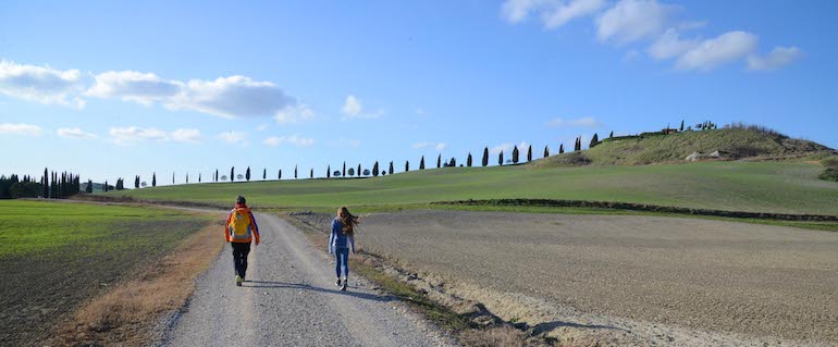 Siamo in Toscana nel territorio di Asciano, solo 16 chilometri a est di Siena, e lasciamo la vettura all’inizio di strada Leonina (185 m/slm) per incamminarci lungo il filare di cipressi seguendo il cartello “Anello delle Biancane di Leonina”. Presto, però, abbandoniamo il suggestivo viale per prendere la strada bianca a sinistra, sempre indicata dal cartello.