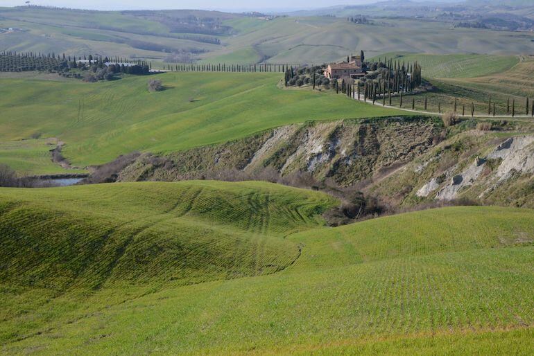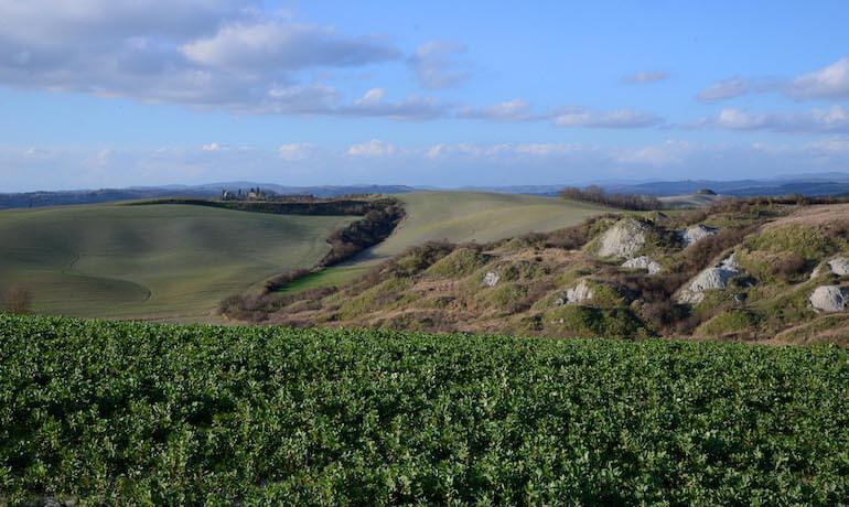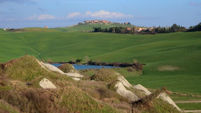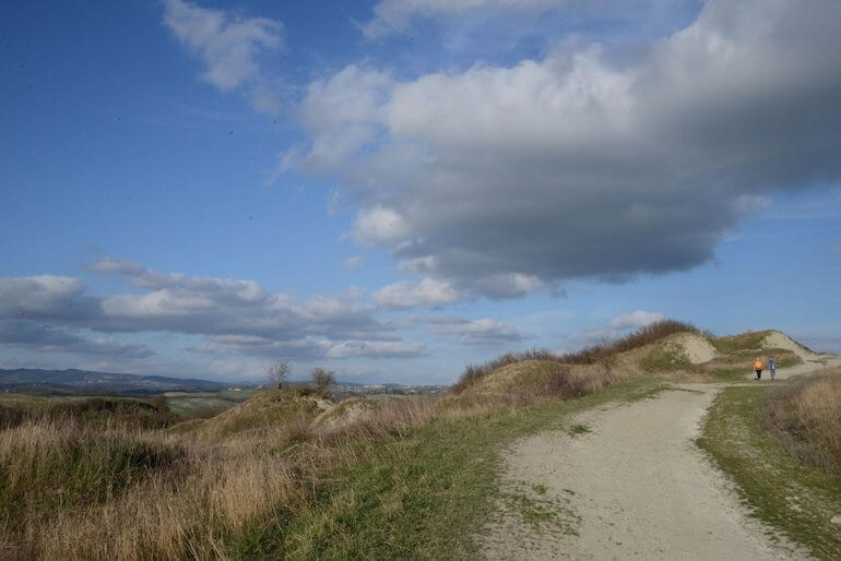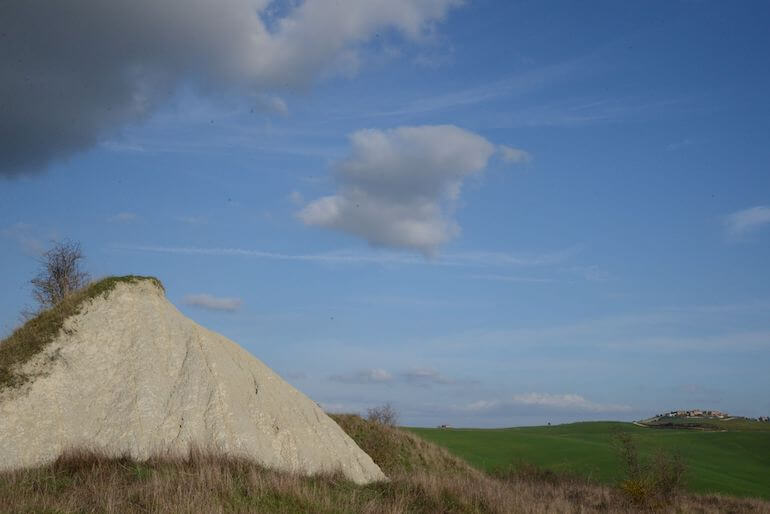 Attraverso ampi campi camminiamo in salita graduale puntando verso un altro filare di cipressi che si erge seguendo il crinale della collina. Giunti in prossimità del podere Fiorentina di Sotto andiamo a destra, affrontando una salita ripida ma breve che ci porta proprio sul ciglio del crinale che sovrasta le Biancane. Il panorama è grandioso da entrambi i lati con coltivazioni a perdita d’occhio, filari di cipressi e casolari sparsi, intervallati da piccoli laghetti. La salita si fa lieve e arriviamo abbastanza rapidamente alla zona delle Biancane vere e proprie, rilievi a forma di cupola dal caratteristico colore bianco che spicca contro il verde dei prati circostanti (230 m/slm).