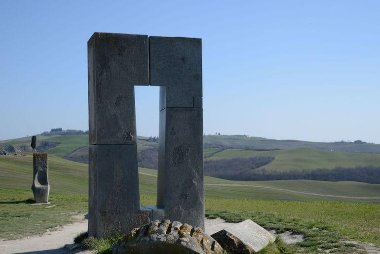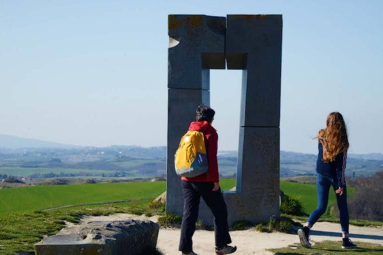 Proseguiamo seguendo l’evidente pista che con andamento graduale ci porta a Poggio Vangelo (264 m/slm). Qui deviamo decisamente a destra in leggera discesa per raggiungere una strada sterrata (260 m/slm) che seguiremo verso sinistra. Pochi passi ed ecco una vera sorpresa: il Site Transitoire (270 m/slm), una “finestra” di pietra ed un sedile, opera dell’artista francese Jean-Paul Philippe. Perché “transitorio”? Perché solo durante il solstizio d’estate il sole tramonta esattamente nel vano della finestra, uno spettacolo da ammirare stando comodamente seduti sul sedile… uno spettacolo unico, dalla durata effimera.