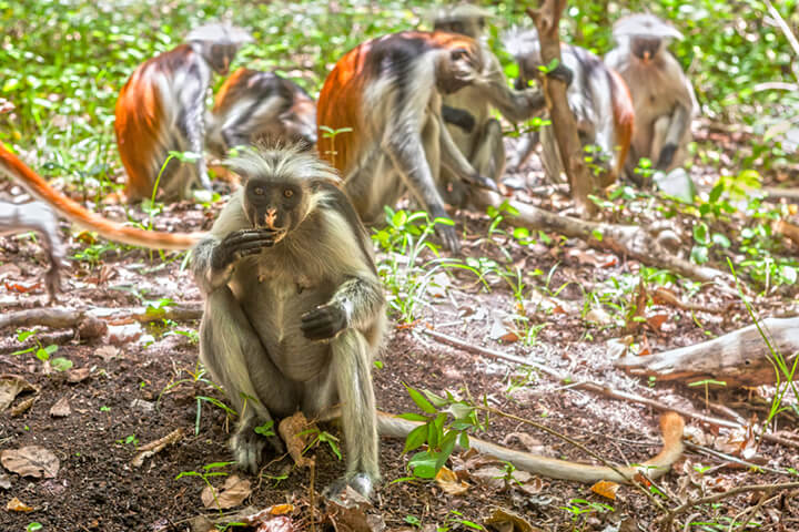 I colobi rossi di Zanzibar rovistano nel terreno alla ricerca di carbone vegetale. Anton Zelenov / Shutterstock.com