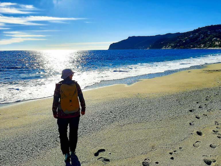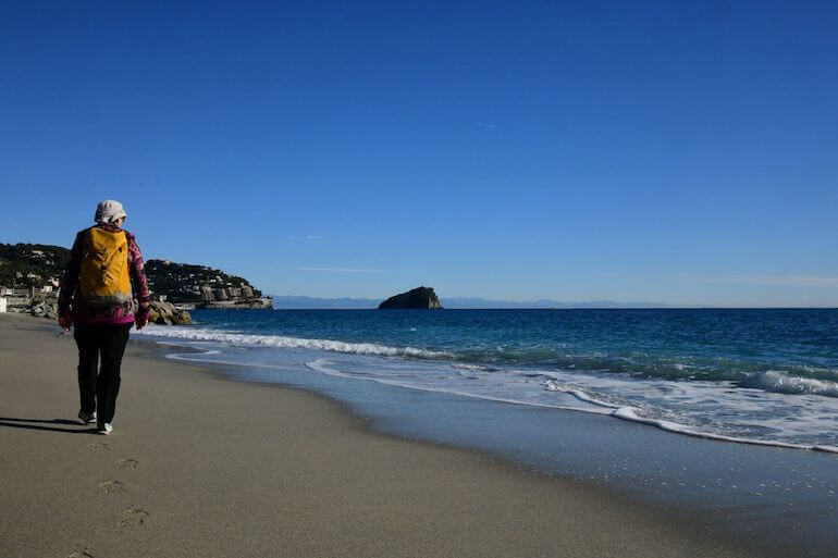 Dopo aver divagato per il centro storico di Spotorno tra negozietti, alte case tipiche e colorate, chiese decorate e qualche passaggio coperto, raggiungiamo la passeggiata lungomare (4 m/slm) dalla quale ci affacciamo sulle larghe spiagge sabbiose, con l’isolotto di Bergeggi sullo sfondo.