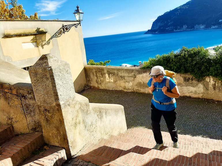 Da regione Chiariventi il tracciato diventa poi davvero rilassante e piacevole, ben segnalato, che si snoda tra muretti a secco e ulivi, quasi sospesi tra il verde e l’azzurro.