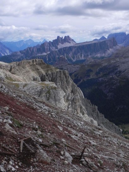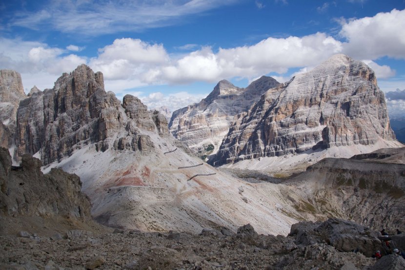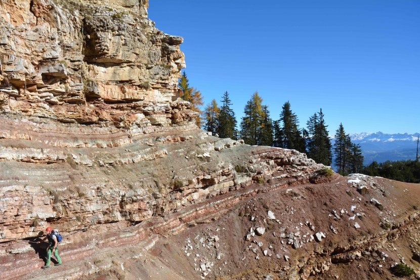 Alla base delle Tofane, nelle Dolomiti centrali, si scorgono i livelli rocciosi rossastri che testimoniano gli eventi legati all’Episodio Pluviale Carnico, 233 milioni di anni fa ©MUSE