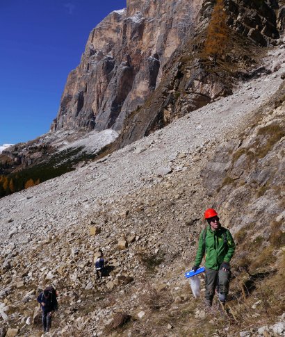 Il geologo Jacopo Dal Corso esamina le evidenze dell’estinzione avvenuta 233 milioni di anni fa presso il Rifugio Dibona, Cortina d’Ampezzo (BL) ©G. Roghi