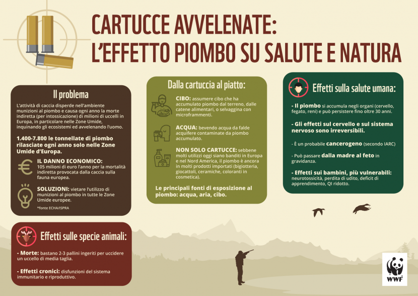 Ogni anno le munizioni dei cacciatori disperdono nell’ambiente miliardi di pallini di piombo che causano la morte indiretta di milioni di uccelli in tutto il mondo (un milione solo nelle zone umide Europee), inquinando gli ecosistemi e, non ultimo, minacciando la salute umana. Il piombo è un metallo altamente tossico, tanto da essere stato bandito da tutti i prodotti di consumo come benzina, vernici, tubature e causa intossicazioni di tipo cronico, con pericolose disfunzioni del sistema immunitario e riproduttivo.