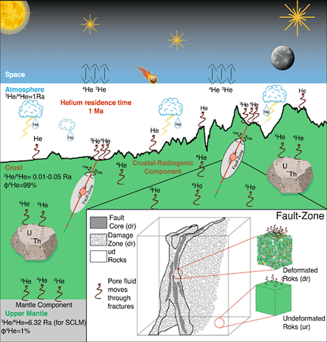 Gli scienziati hanno, pertanto, concluso che esiste una relazione quantitativa tra i flussi di elio crostale e il volume nelle zone di faglia. Ciò fa ipotizzare che le variazioni nel flusso di elio possono rappresentare un indicatore dei cambiamenti nello stress delle faglie correlandolo così ai terremoti.
