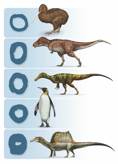 Confrontando i femori sezionati di uccelli e dinosauri carnivori si vede chiaramente che la cavità interna è più ridotta nelle specie adattate a uno stile di vita semiacquatico (dall’alto: kiwi, tirannosauro, sucomimo, pinguino, spinosauro). © Davide Bonadonna, Prehistoric Minds