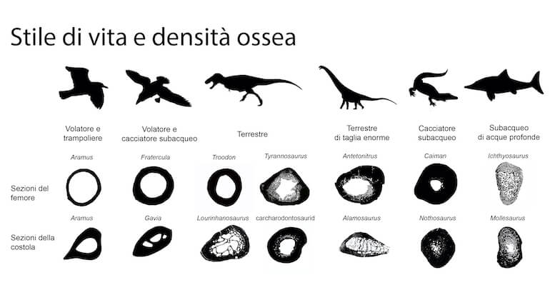 Sezionando e osservando al microscopio le ossa di rettili, mammiferi e uccelli, sia fossili che attuali, i ricercatori hanno notato che maggiore è la densità del tessuto osseo, più un animale è idoneo a vivere e nutrirsi in acqua.