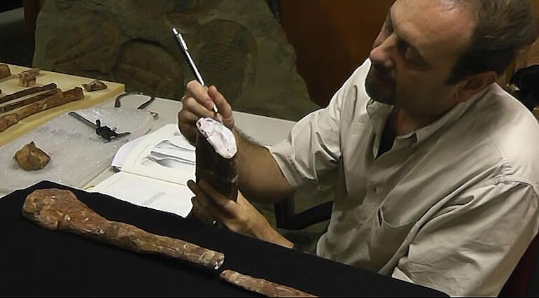 Il paleontologo Cristiano Dal Sasso esamina una tibia di spinosauro, notando che l’osso fratturatosi durante gli scavi appare denso e compatto, senza cavità midollare: una caratteristica che lo distingue da tutti gli altri dinosauri. © Museo di Storia Naturale di Milano