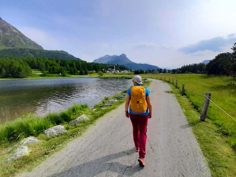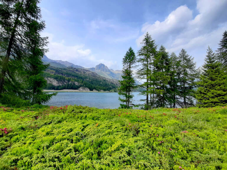 La cima è facilmente accessibile con una scala interna e la terrazza regala una vista impagabile verso il lago Sils dalle azzurre acque e sulle montagne che circondano il passo. Scendiamo quindi attraverso la zona delle marmitte dei giganti formatosi dopo l’ultima glaciazione, circa 10 mila anni fa.