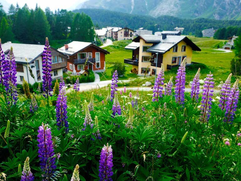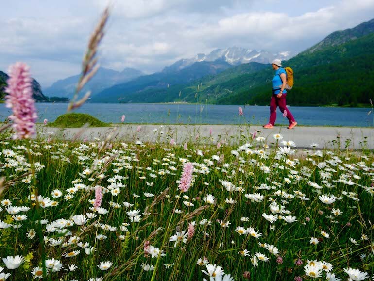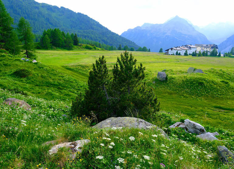Proseguiamo quindi verso il lago Sils e le molte panchine poste lungo le sue rive, tutte in posizione panoramica, per poi camminare tranquillamente verso la chiesa bianca, anch’essa presente nella vita del pittore o, per meglio dire, la morte poiché ospito la salma di Segantini, le cui ultime parole furono: «Voglio vedere le mie montagne». Il poeta, infatti, riposa nel vicino cimitero e costeggiandone la cinta ci inoltriamo in una bucolica zona di pascoli dove nel periodo estivo le fioriture sono davvero spettacolari e multicolori e dove si ha davvero l’impressione di scovare il pittore “della luce” intento a dipingere con il suo cavalletto davanti ad uno di questi scorci di paesaggio montano.
