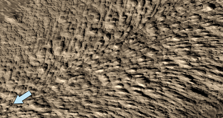 Strutture a “chevron” (o strutture a spina di pesce) formate dal movimento dei SEP nella direzione indicata dalla freccia. © NASA-MRO-HiRISE