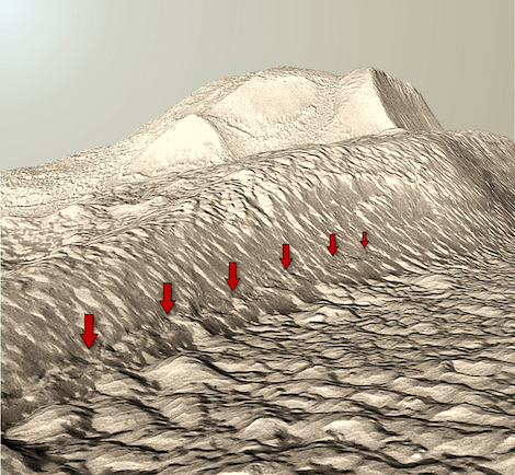 Riproduzione tridimensionale in falsi colori della lingua glaciale che scorrendo a valle all’interno del canale produce le fratture caratteristiche (fratture en-echelon) indicate dalle frecce rosse. © Elaborazione da immagini NASA-MRO-HiRISE
