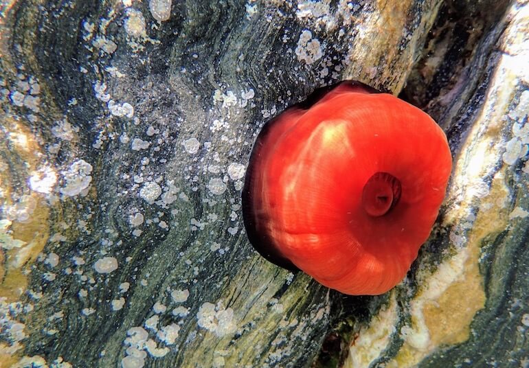 Il pomodoro di mare (Actinia equina) vive attaccato agli scogli sulla linea dei flutti e si riconosce subito per il colore rosso intenso del corpo, dal quale escono quasi duecento piccoli tentacoli. Quando queste appendici sono ritratte l’animale assume la forma di un piccolo pomodoro di circa 6 cm di diametro. Come molti altri Attinidi, la specie è urticante anche se in misura minore del diffuso anemone di mare.