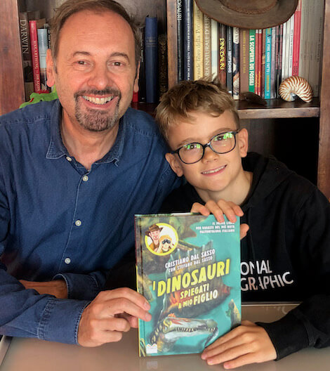 - Cristiano Dal Sasso e il figlio Stefano, che a otto anni ha aiutato il papà paleontologo a scrivere il libro ora edito da Mondadori per Piemme. Foto di Silvia Dal Sasso.